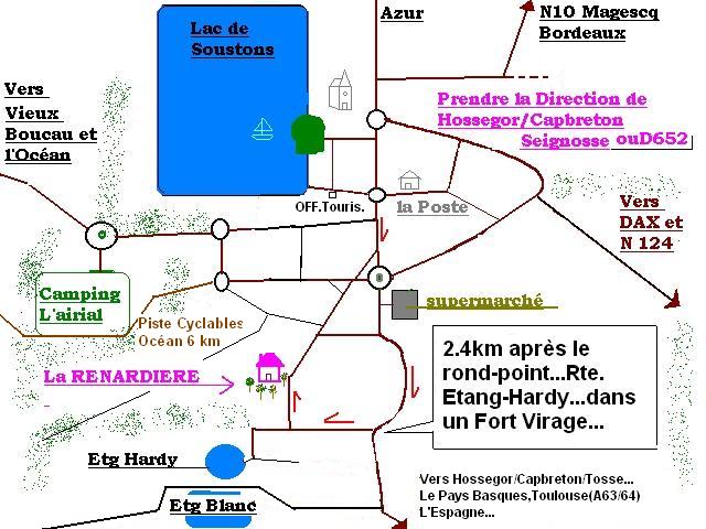 When on the N, go towards Soustons. At Soustons go in the direction of Tosse/Hossegor (D652)the supermarket after 2 >Kms, in a curve turn right into a small road called "Route de l'étang Hardy".